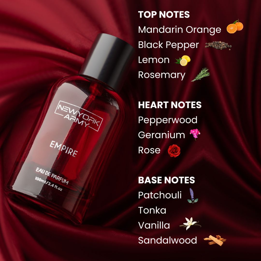 Empire opens with a citrusy spice, evolves into a floral heart, and settles into a warm, woody base that lingers for hours.
